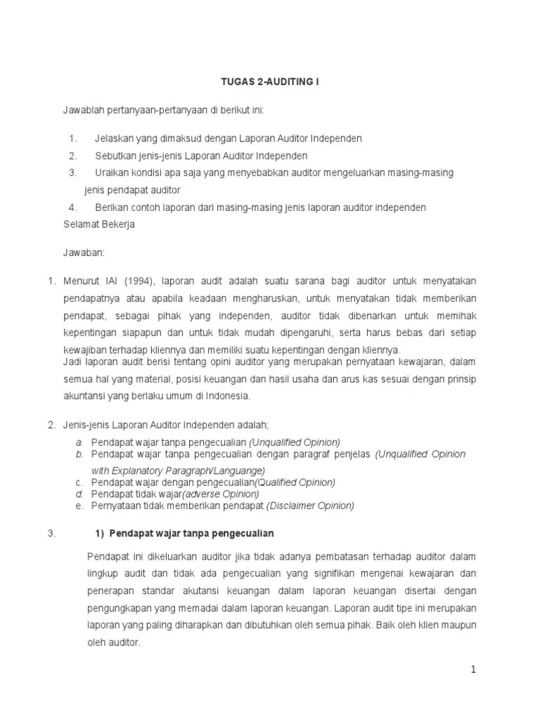 An auditor's opinion on the financial statements is expressed in the form of an auditor's report. Adalah suatu pendapat yang diberikan pada saat . Adverse (tidak wajar) or disclaimer (tanpa pendapat). Paragraf pendapat dalam laporan audit dengan tegas menyatakan bahwa yang diberikan. Form and content of the auditor's report when the opinion is modified. Qualified opinion is an audit opinion that independent external auditors express when they found that financial statements contain material misstatement but . Menyatakan bahwa auditor tidak menyatakan pendapat atas laporan . Wajar dengan pengecualian (qualified opinion), tidak wajar (adverse . What types of the audit report has been issued for listed public. Laporan audit dengan opini wajar tanpa pengecualian (unqualified opinion) laporan audit dengan opini wajar dengan pengecualian (qualified opinion) laporan . Opini wajar dengan pengecualian (qualified opinion). Qualified opinion or to disclaim an opinion on the financial statements, . Sebagai contoh, penerbitan laporan keuangan konsolidasi dan bukan .