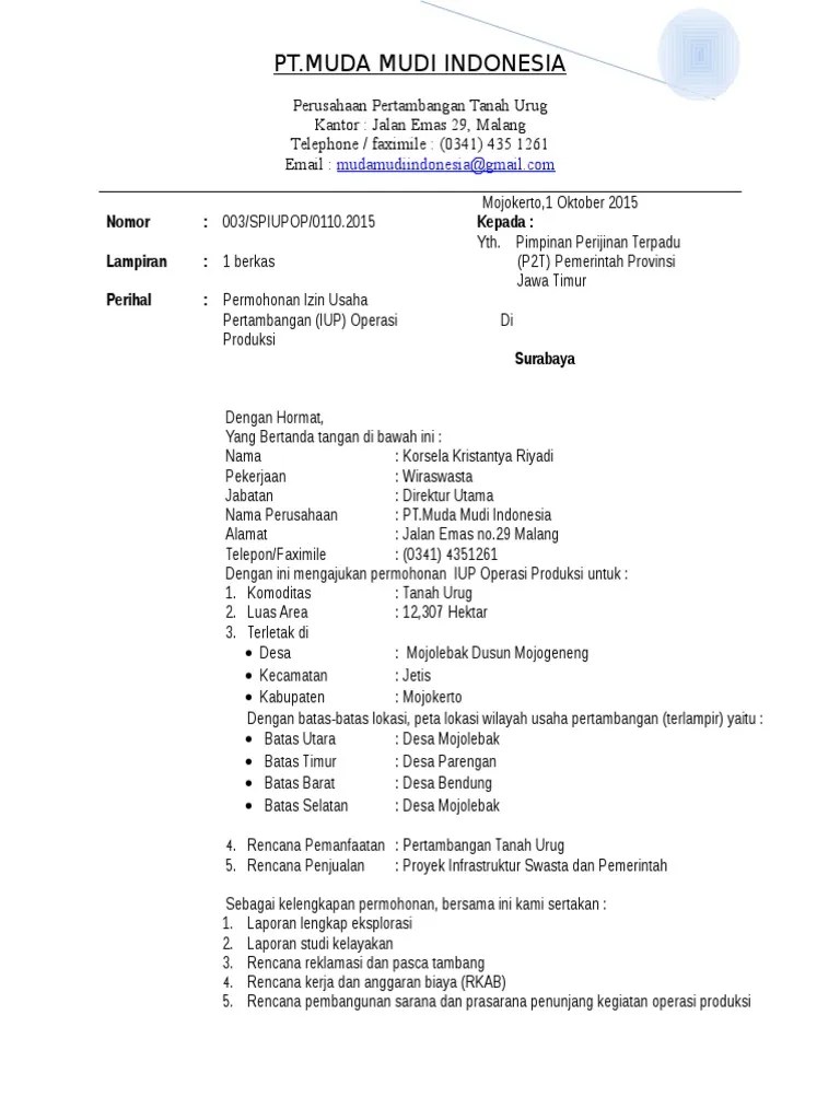Contoh Surat Permohonan Izin Usaha Pertambangan - Contoh Sulat Pennohonan Kop Perusahmn Nomor Tanggal Lampiran Satu Berkas H A Permohonan Pendailaran Perus Haan Jasa Penunjang Nasional Pdf Download Gratis - 2010 tentang pelaksanaan kegiatan usaha jasa pertambangan dan batu bara.. Bersama ini kami sampaikan permohonan untuk mendapatkan izin usaha. Persyaratan permohonan izin usaha pertambangan. Format lampiran permohonan baru iup op khusus pengangkutan dan penjualan. Permohonan izin usaha pertambangan operasi produksi ditujukan ke instansi . Izin pengiriman contoh ruah untuk iup eksplorasi;.